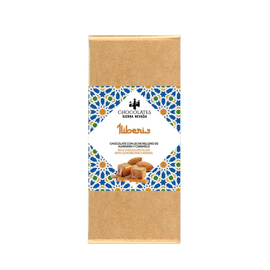 Tableta de chocolate con leche con almendras molidas, fundidas en chocolate con leche y caramelo. producto elaborado a mano con una cuidada dedicación y esmero.