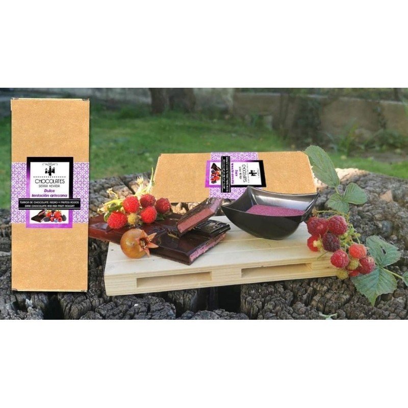Deliciosa tableta, relleno de crujiente de frutos rojos y recubierto con chocolate negro